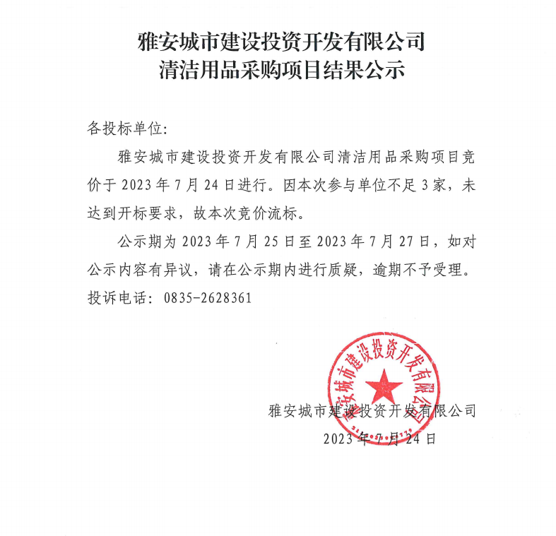 雅安城市建設(shè)投資開(kāi)發(fā)有限公司清潔用品采購(gòu)項(xiàng)目結(jié)果公示
