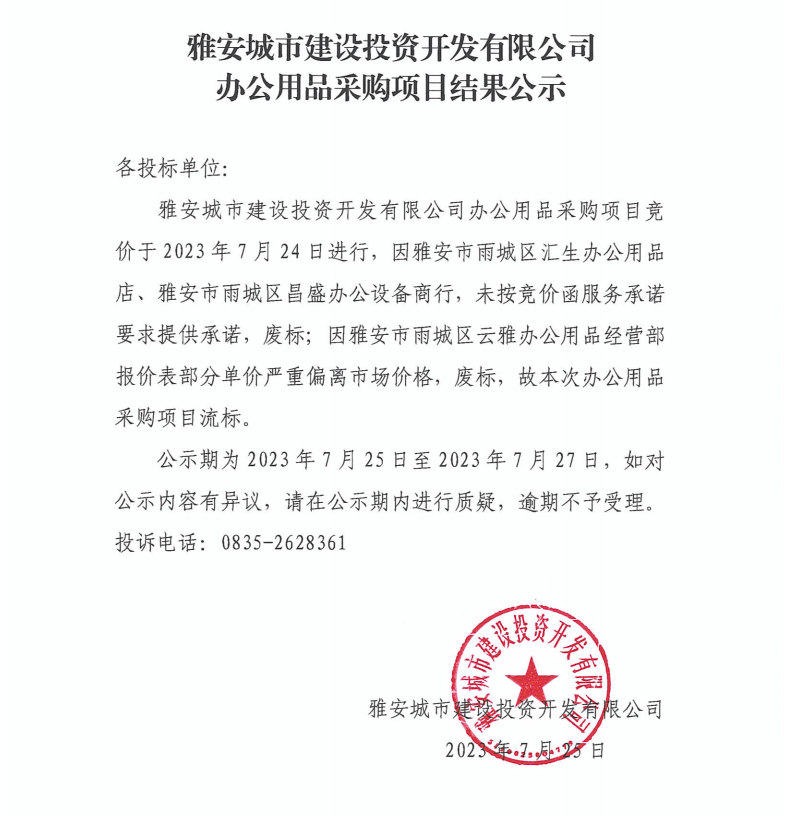 雅安城市建設(shè)投資開發(fā)有限公司辦公用品采購項(xiàng)目結(jié)果公示