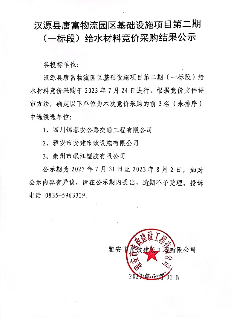漢源縣唐富物流園區(qū)基礎(chǔ)設(shè)施項(xiàng)目第二期(一標(biāo)段)給水材料競(jìng)價(jià)采購(gòu)結(jié)果公示