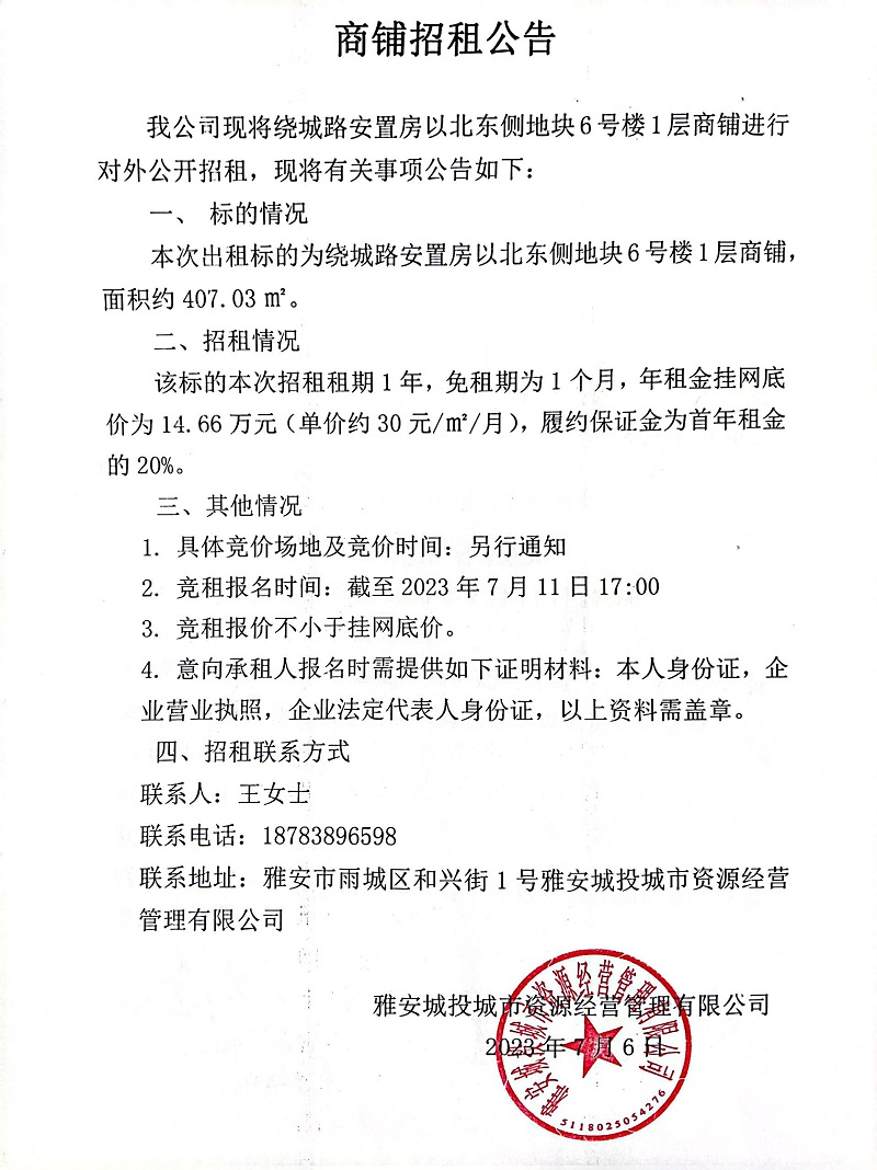 繞城路安置房以北東側地塊6號樓1層商鋪招租公告