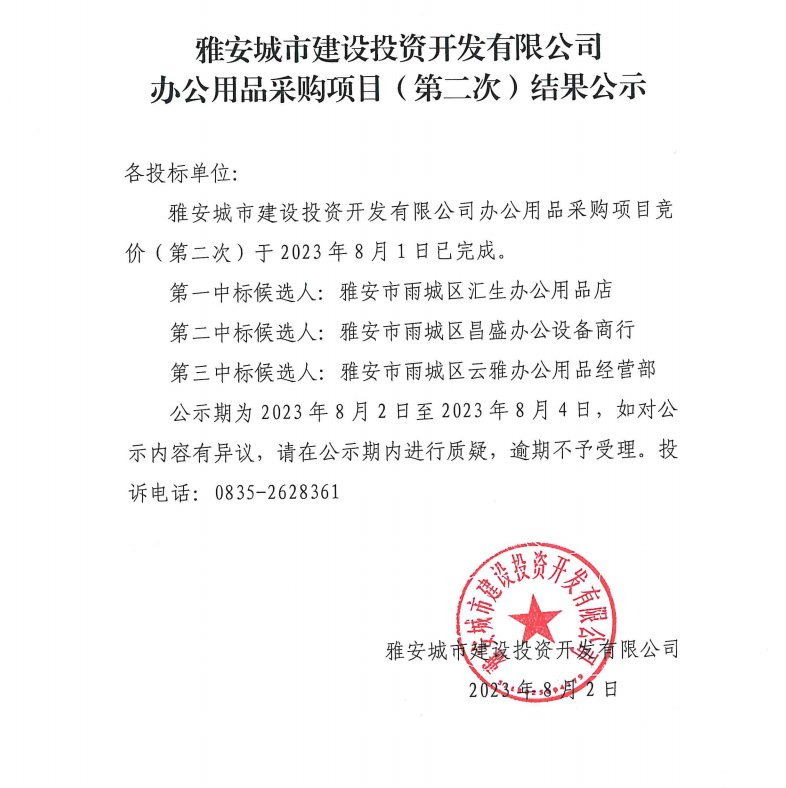 雅安城市建設(shè)投資開發(fā)有限公司辦公用品采購項目(第二次)結(jié)果公示