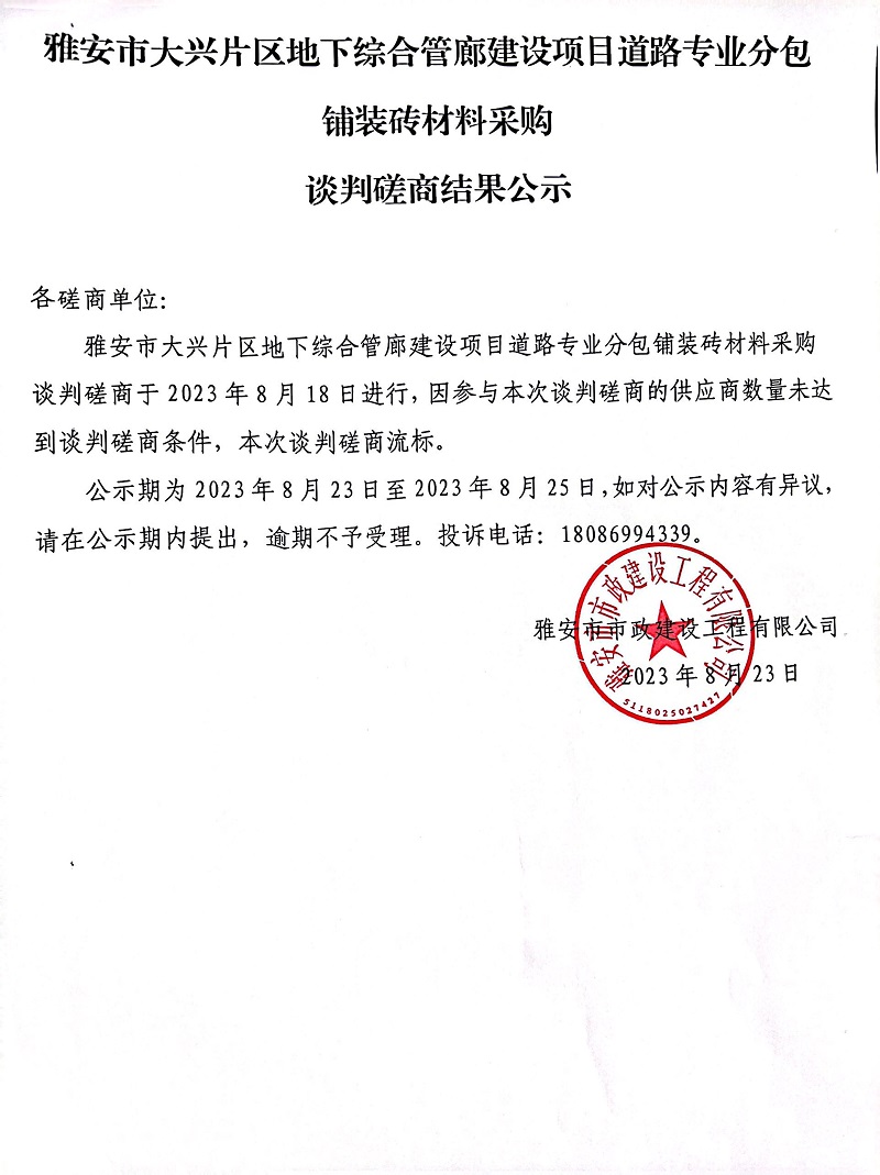 雅安市大興片區(qū)地下綜合管廊建設項目道路專業(yè)分包鋪裝磚材料采購談判磋商結(jié)果公示