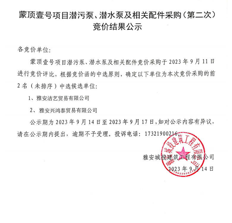 蒙頂壹號(hào)項(xiàng)目潛污泵、潛水泵及相關(guān)配件采購(gòu)(第二次)競(jìng)價(jià)結(jié)果公示