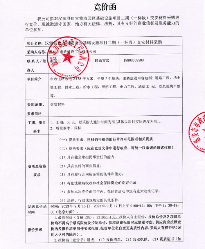 漢源縣唐富物流園區(qū)基礎(chǔ)設(shè)施項目二期(一標(biāo)段)交安材料采購競價公告