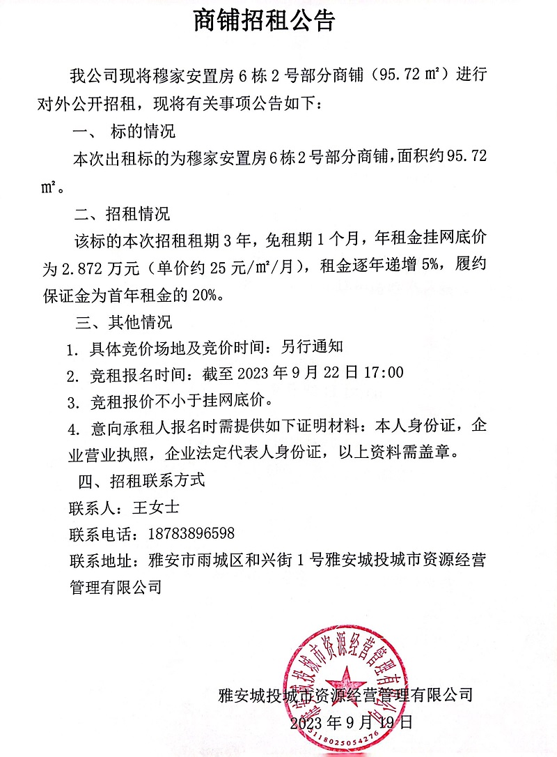 穆家安置房6棟2號(hào)部分商鋪招租公告