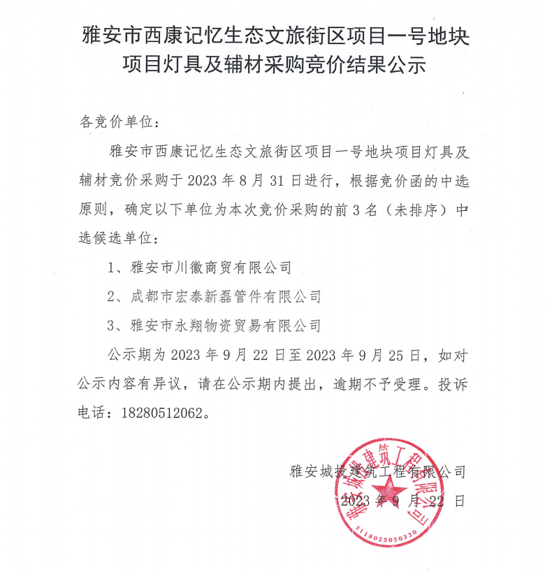 雅安市西康記憶生態(tài)文旅街區(qū)項(xiàng)目一號(hào)地塊項(xiàng)目燈具及輔材采購(gòu)競(jìng)價(jià)結(jié)果公示