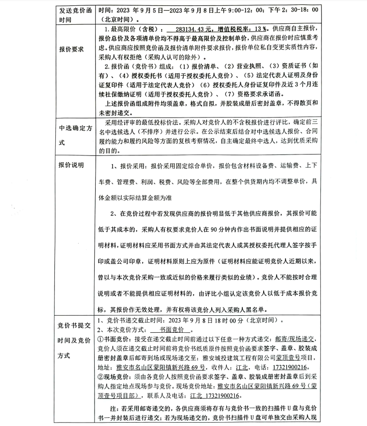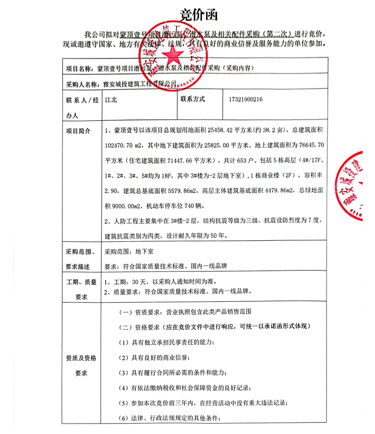 蒙頂壹號(hào)項(xiàng)目潛污泵、潛水泵及相關(guān)配件采購(第二次)競(jìng)價(jià)公告