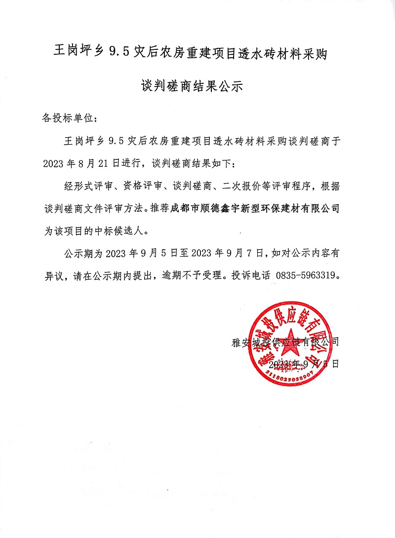 王崗坪鄉(xiāng)9.5災后農(nóng)房重建項目透水磚材料采購談判磋商結(jié)果公示