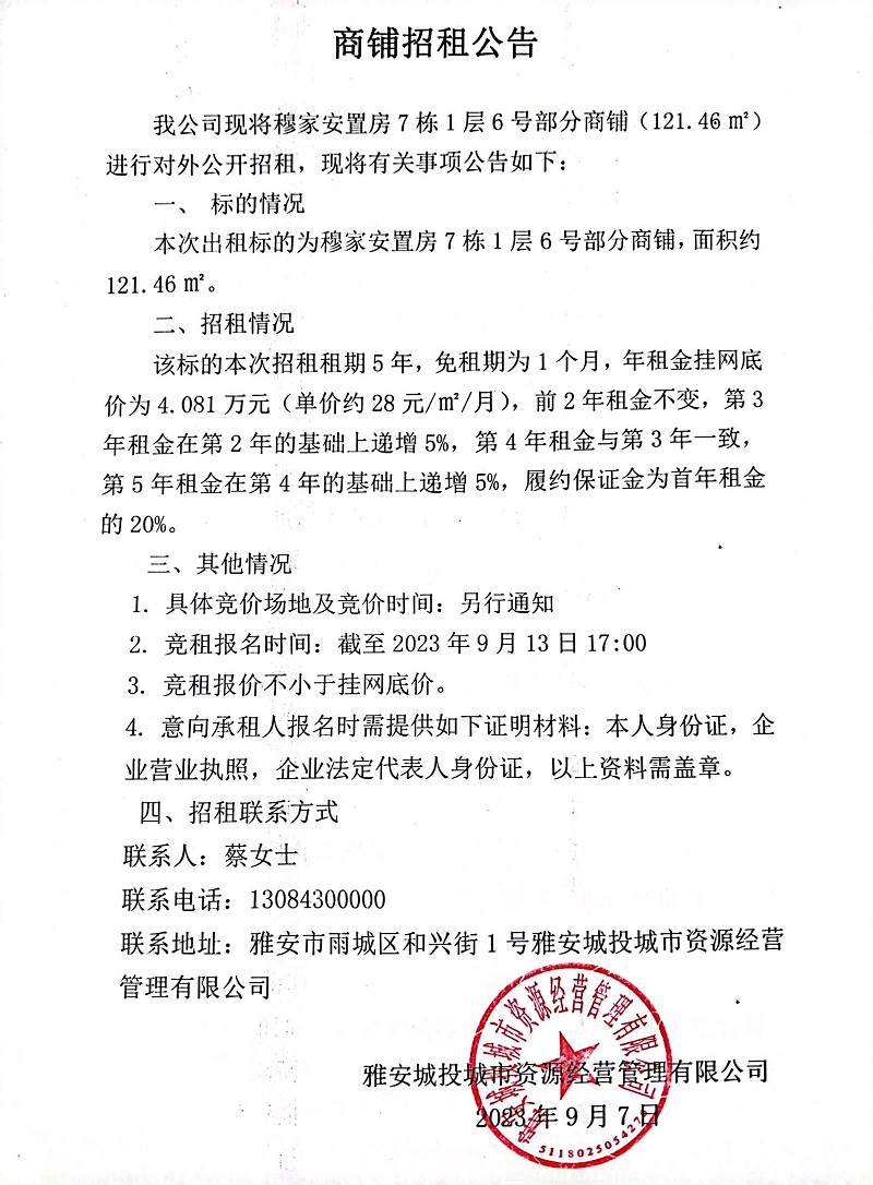 穆家安置房7棟1層6號部分商鋪招租公告