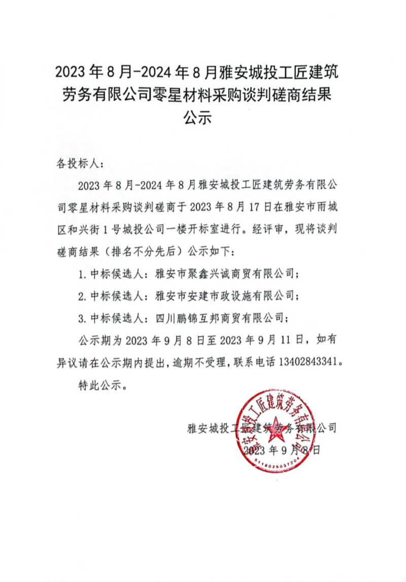 2023年8月-2024年8月雅安城投工匠建筑勞務(wù)有限公司零星材料采購(gòu)談判磋商結(jié)果公示