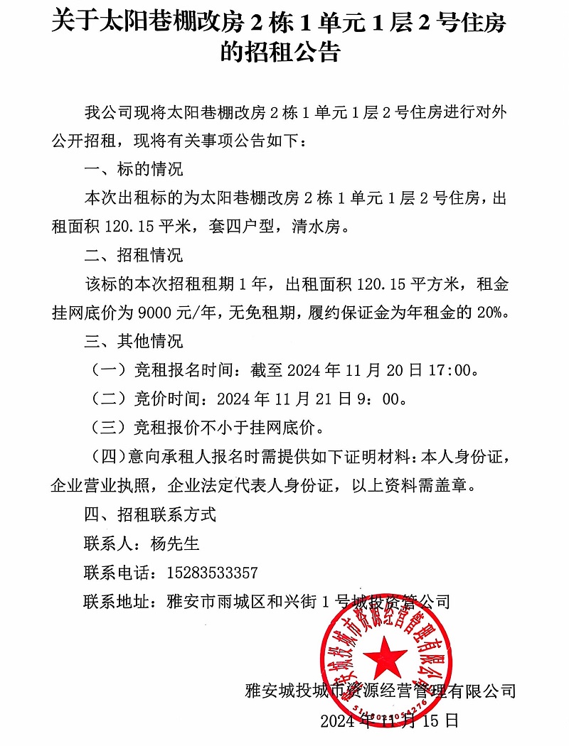 關于太陽巷棚改房2棟1單元1層2號住房的招租公告