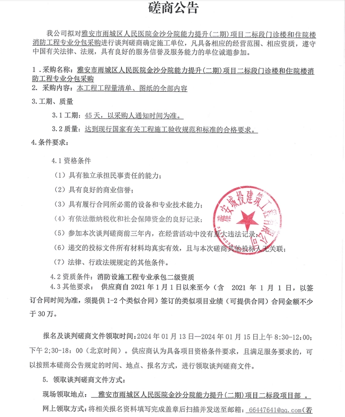 雅安雨城區(qū)人民醫(yī)院金沙分院能力提升(二期)項目二標段門診樓和住院樓消防工程專業(yè)分包采購談判磋商公告