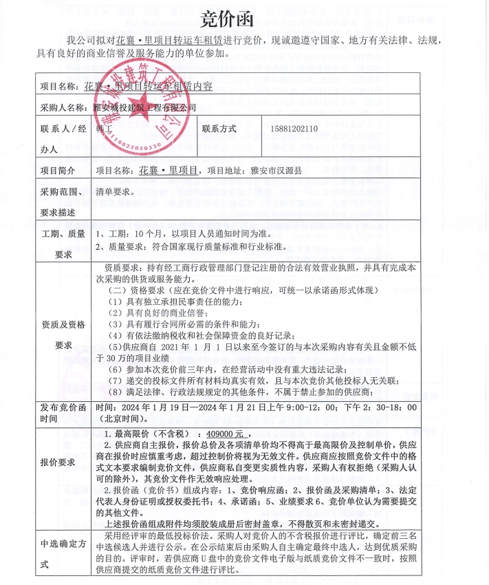 花襄·里項目轉運車租賃競價公告