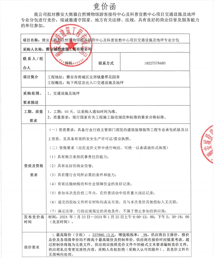 雅安大熊貓自然博物館游客接待中心及科普宣教中心項(xiàng)目交通設(shè)施及地坪專業(yè)分包競價(jià)公告