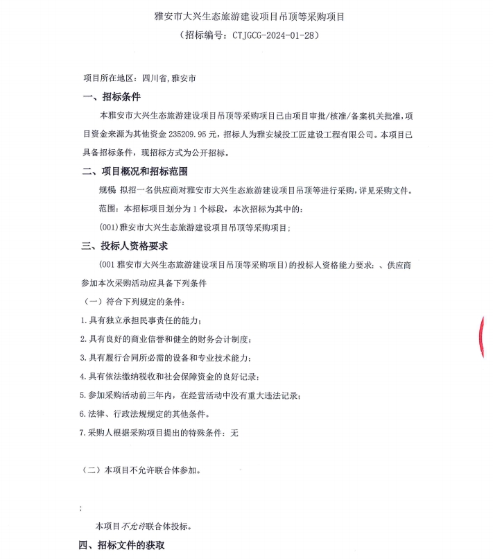 雅安市大興生態(tài)旅游建設(shè)項(xiàng)目吊頂?shù)炔少?gòu)項(xiàng)目公告