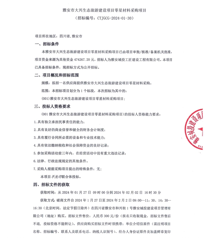 雅安市大興生態(tài)旅游建設(shè)項(xiàng)目零星材料采購(gòu)項(xiàng)目公告