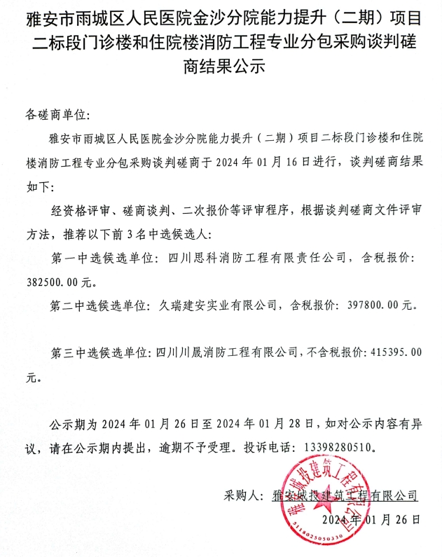 雅安市雨城區(qū)人民醫(yī)院金沙分院能力提升(二期)項(xiàng)目二標(biāo)段門診樓和住院樓消防工程專業(yè)分包采購談判磋商結(jié)果公示