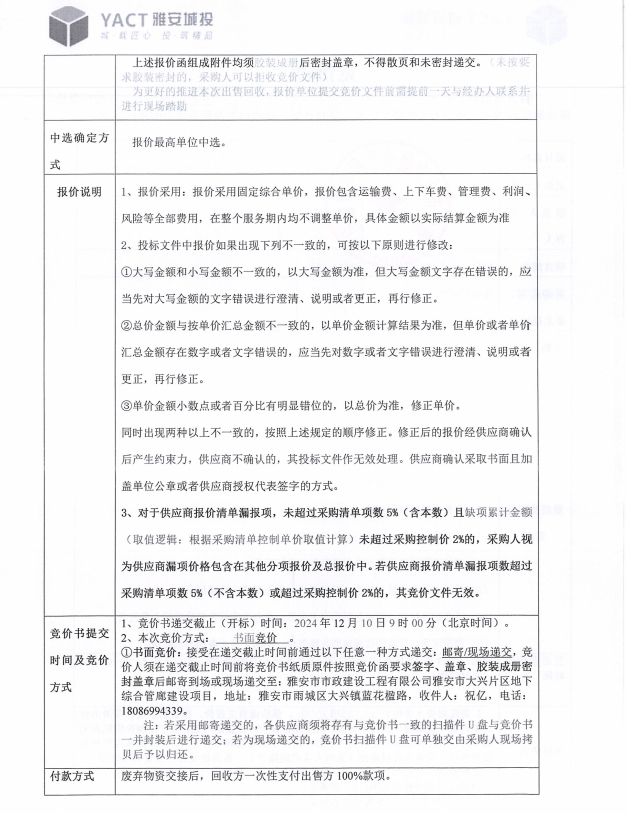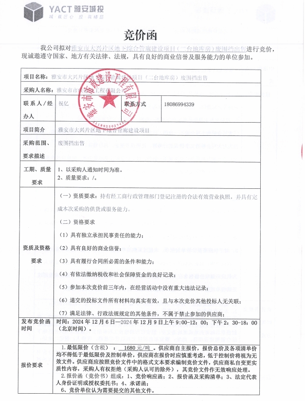 雅安市大興片區(qū)地下綜合管廊建設(shè)項(xiàng)目(二臺地庫房)廢圍擋出售競價公告