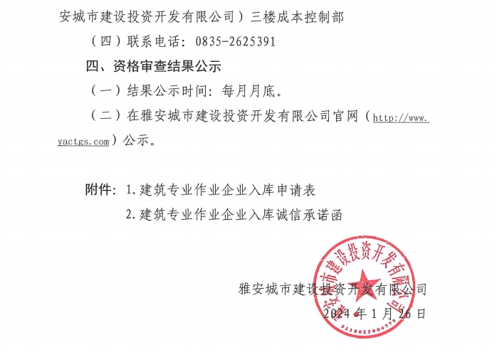 雅安城市建設(shè)投資開發(fā)有限公司關(guān)于建筑專業(yè)作業(yè)企業(yè)入庫的邀請公告