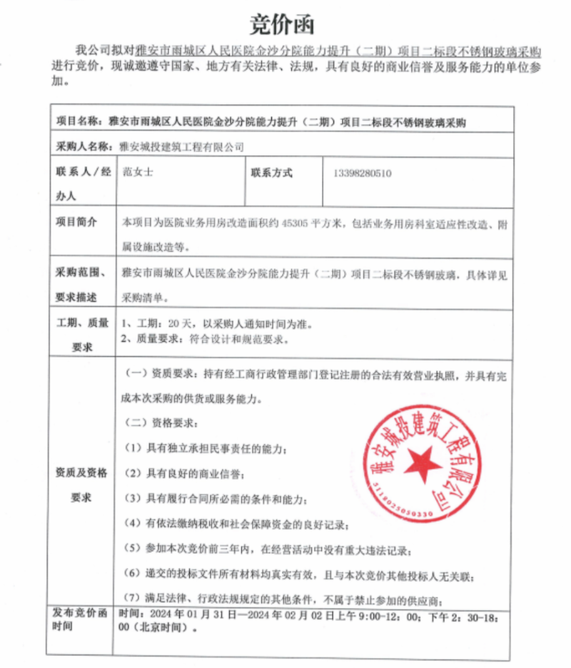 雅安市雨城區(qū)人民醫(yī)院金沙分院能力提升(二期)項(xiàng)目二標(biāo)段不銹鋼玻璃采購(gòu)競(jìng)價(jià)公告