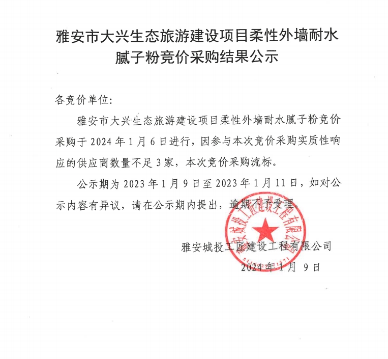 雅安市大興生態(tài)旅游建設(shè)項(xiàng)目柔性外墻耐水膩?zhàn)臃鄄牧细?jìng)價(jià)采購(gòu)結(jié)果公示