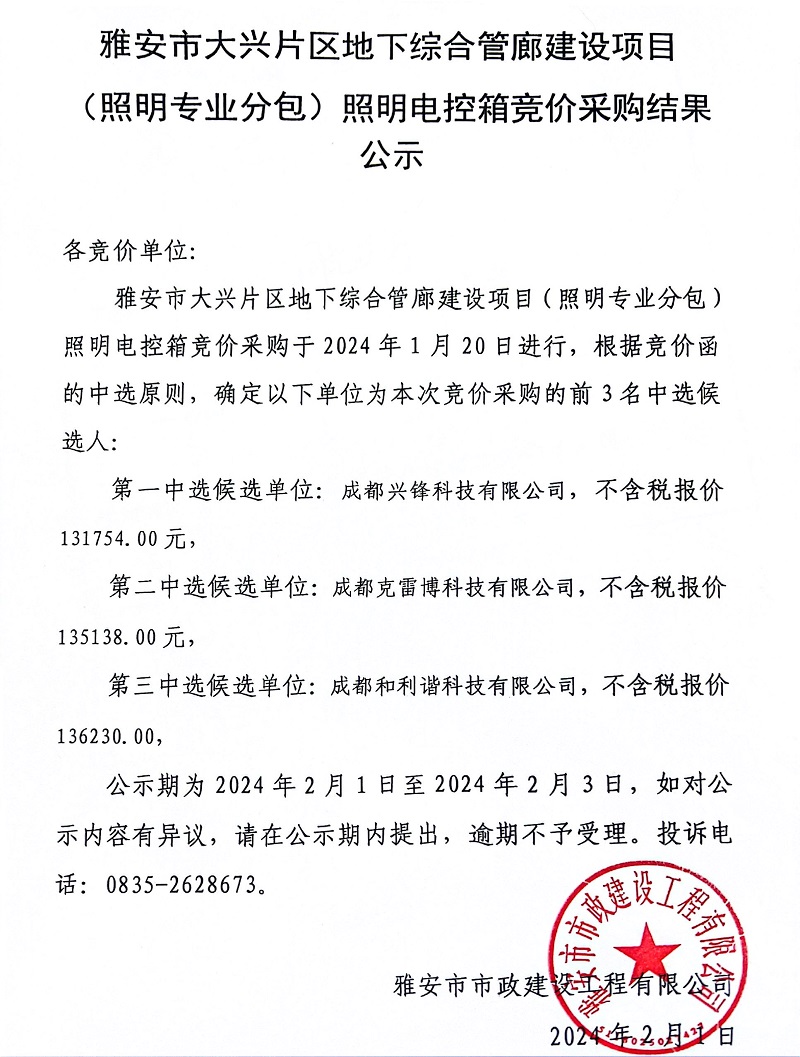 雅安市大興片區(qū)地下綜合管廊建設(shè)項(xiàng)目(照明專業(yè)分包)照明電控箱競(jìng)價(jià)采購(gòu)結(jié)果公示