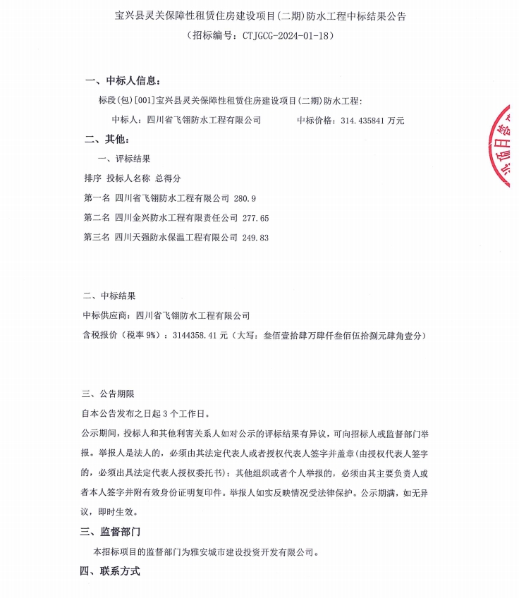 寶興縣靈關(guān)保障性租賃住房建設(shè)項目(二期)防水工程中標(biāo)結(jié)果公告