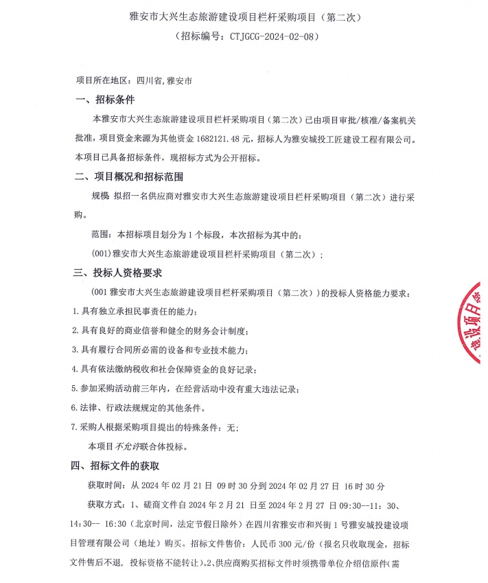 雅安市大興生態(tài)旅游建設(shè)項目欄桿采購項目(第二次)公告