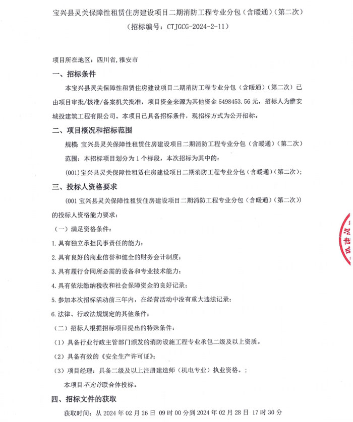 寶興縣靈關(guān)保障性租賃住房建設(shè)項(xiàng)目二期消防工程專業(yè)分包(含暖通)(第二次)公告