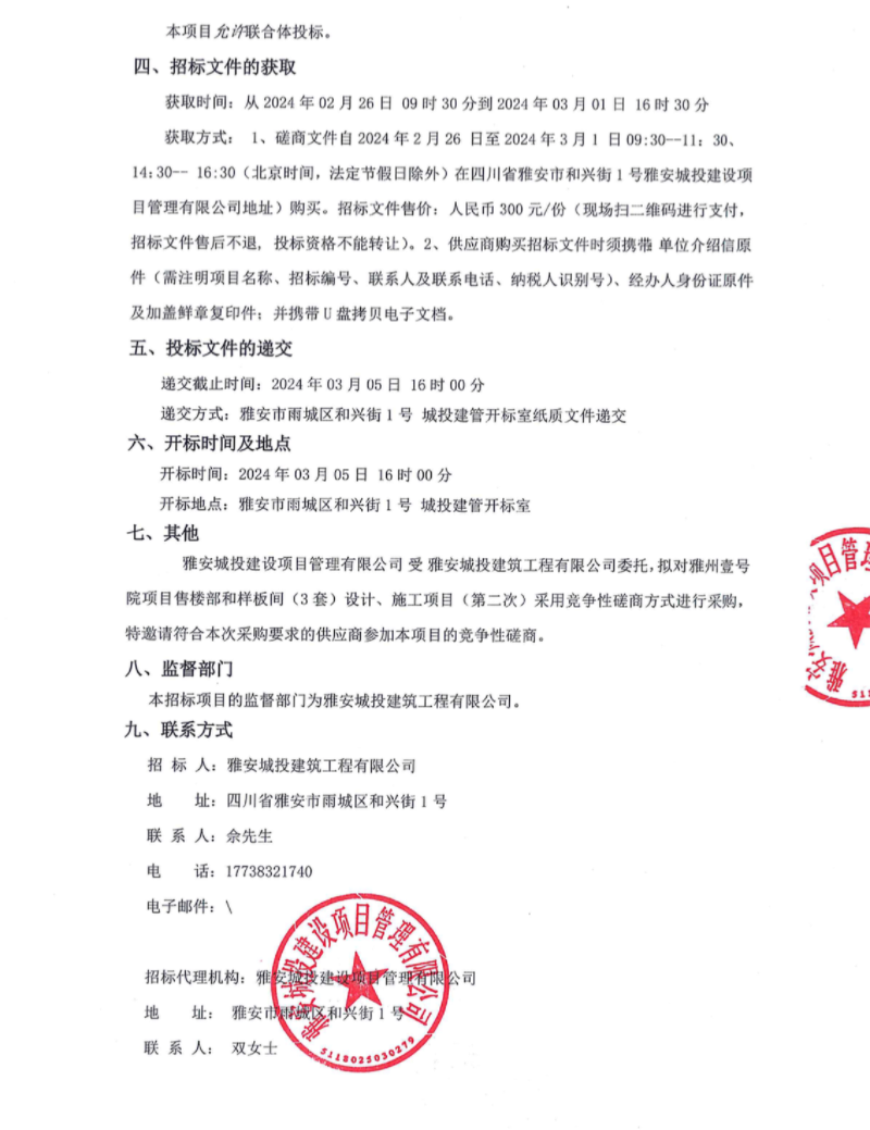 雅州壹號院項目售樓部和樣板間(3套)設(shè)計、施工項目(第二次)公告