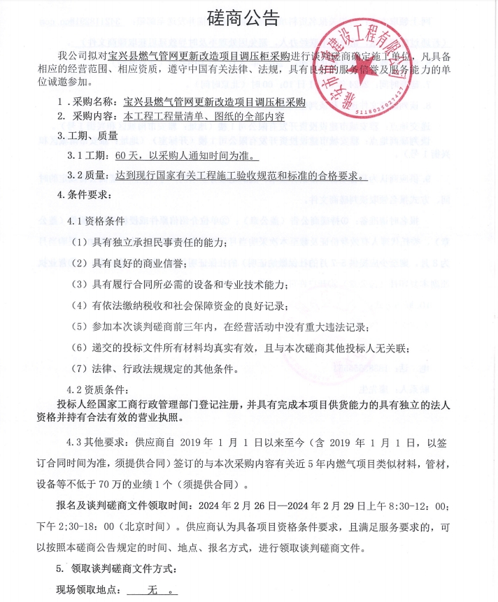 寶興縣燃?xì)夤芫W(wǎng)更新改造項(xiàng)目調(diào)壓柜采購談判磋商公告