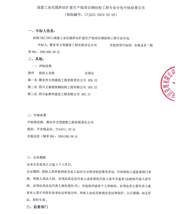 成建工業(yè)化攪拌站擴(kuò)建生產(chǎn)線項目鋼結(jié)構(gòu)工程專業(yè)分包中標(biāo)結(jié)果公告