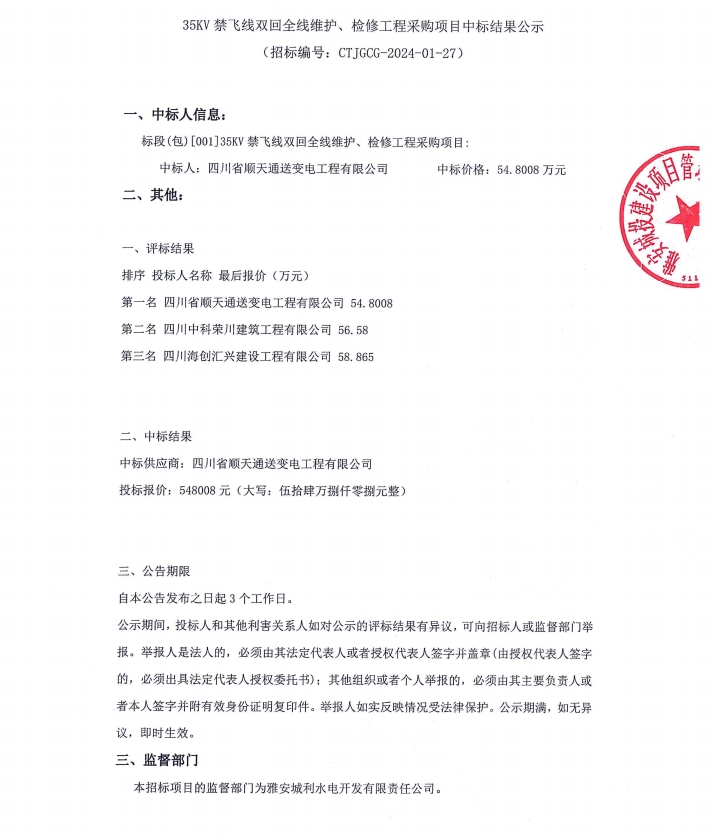 35KV禁飛線雙回全線維護(hù)、檢修工程采購(gòu)項(xiàng)目中標(biāo)結(jié)果公示