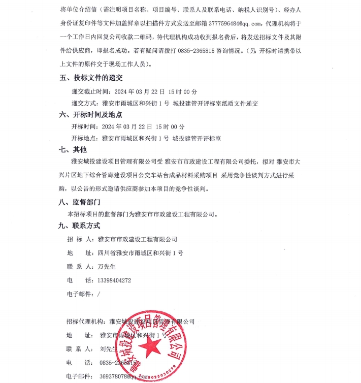 雅安市大興片區(qū)地下綜合管廊建設(shè)項(xiàng)目公交車站臺(tái)成品材料采購項(xiàng)目公告