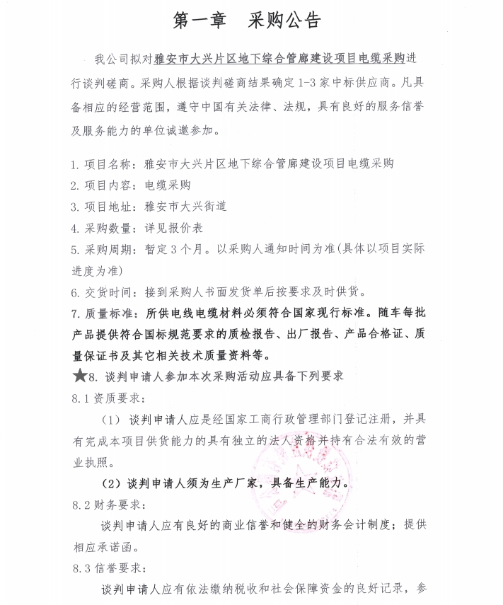 雅安市大興片區(qū)地下綜合管廊建設項目電纜采購公告