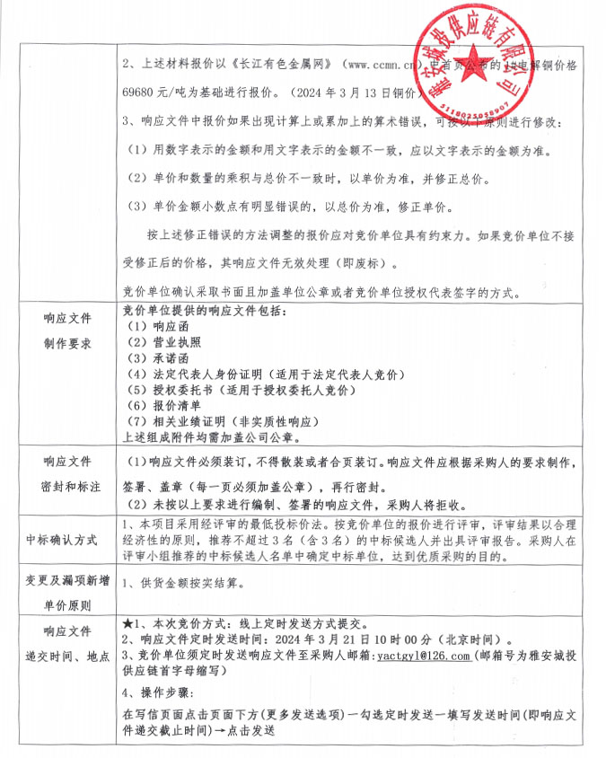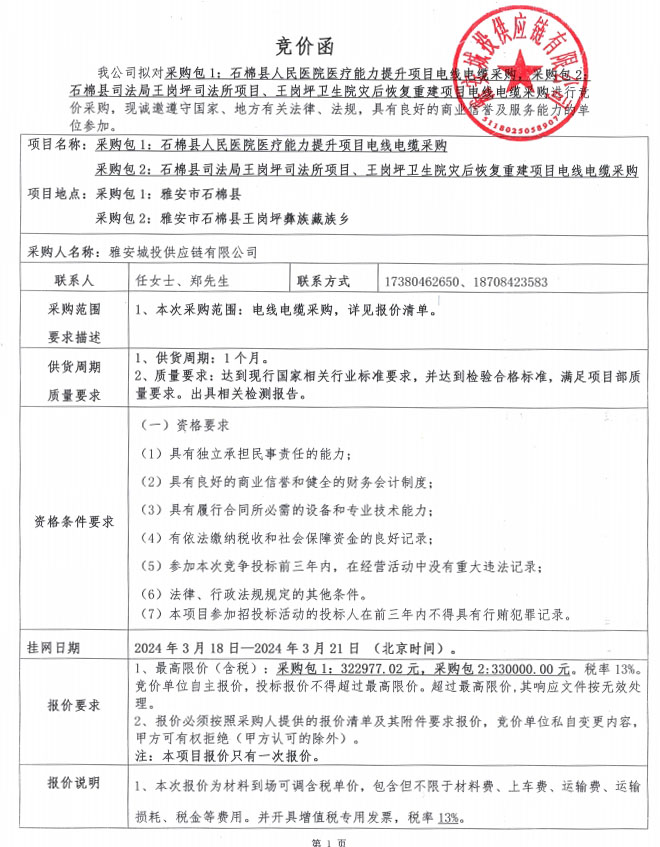雅安城投供應(yīng)鏈有限公司電線電纜采購競價公告