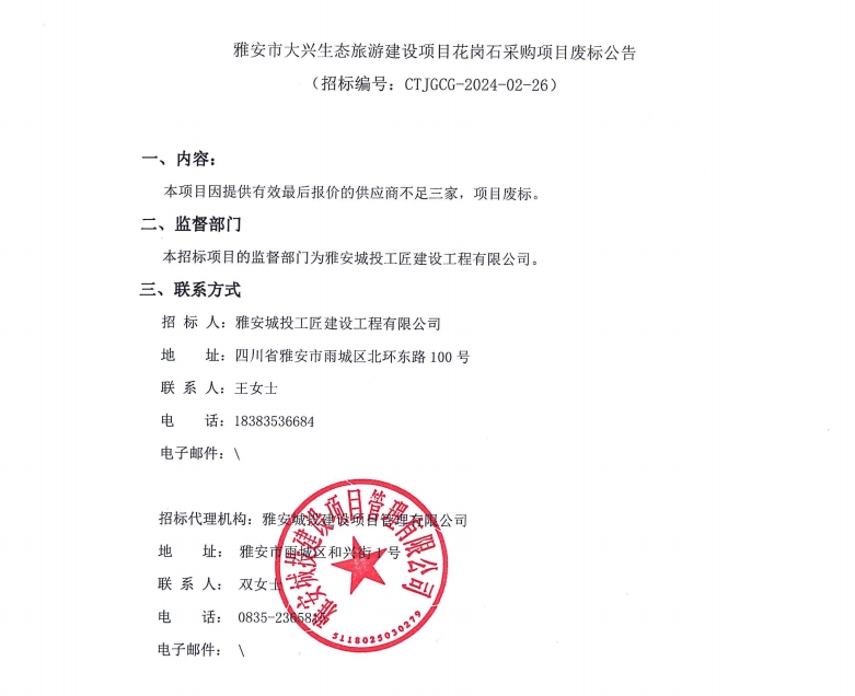 雅安市大興生態(tài)旅游建設(shè)項目花崗石采購項目廢標公告
