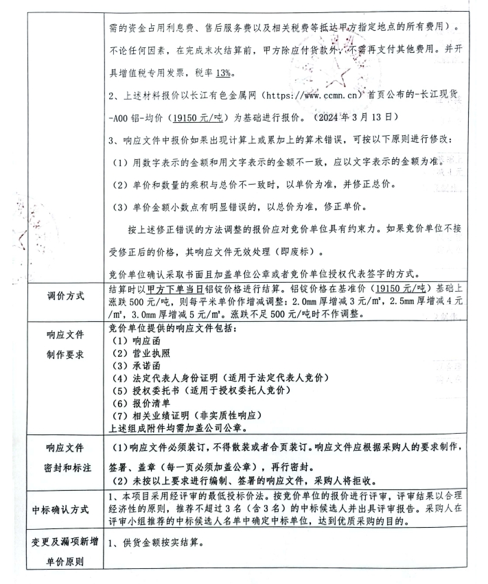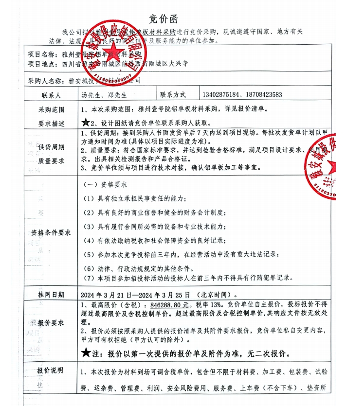 雅州壹號院鋁單板材料采購競價(jià)公告