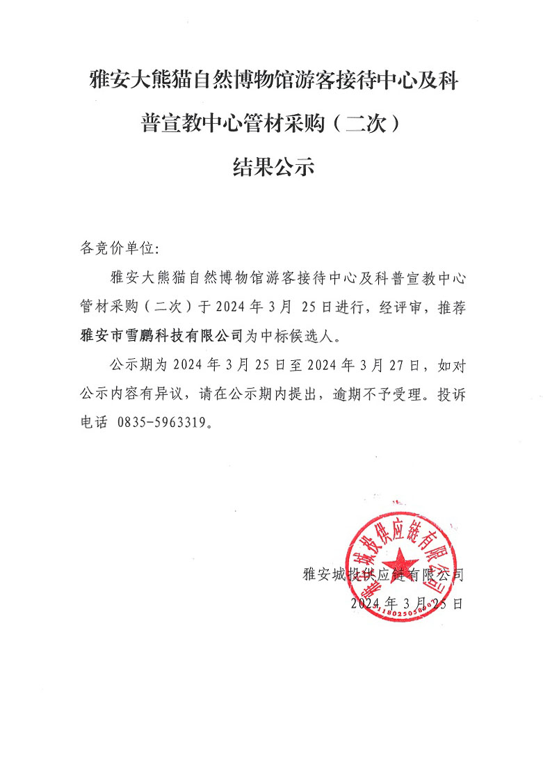 雅安大熊貓自然博物館游客接待中心及科普宣教中心管材采購(二次)結(jié)果公示