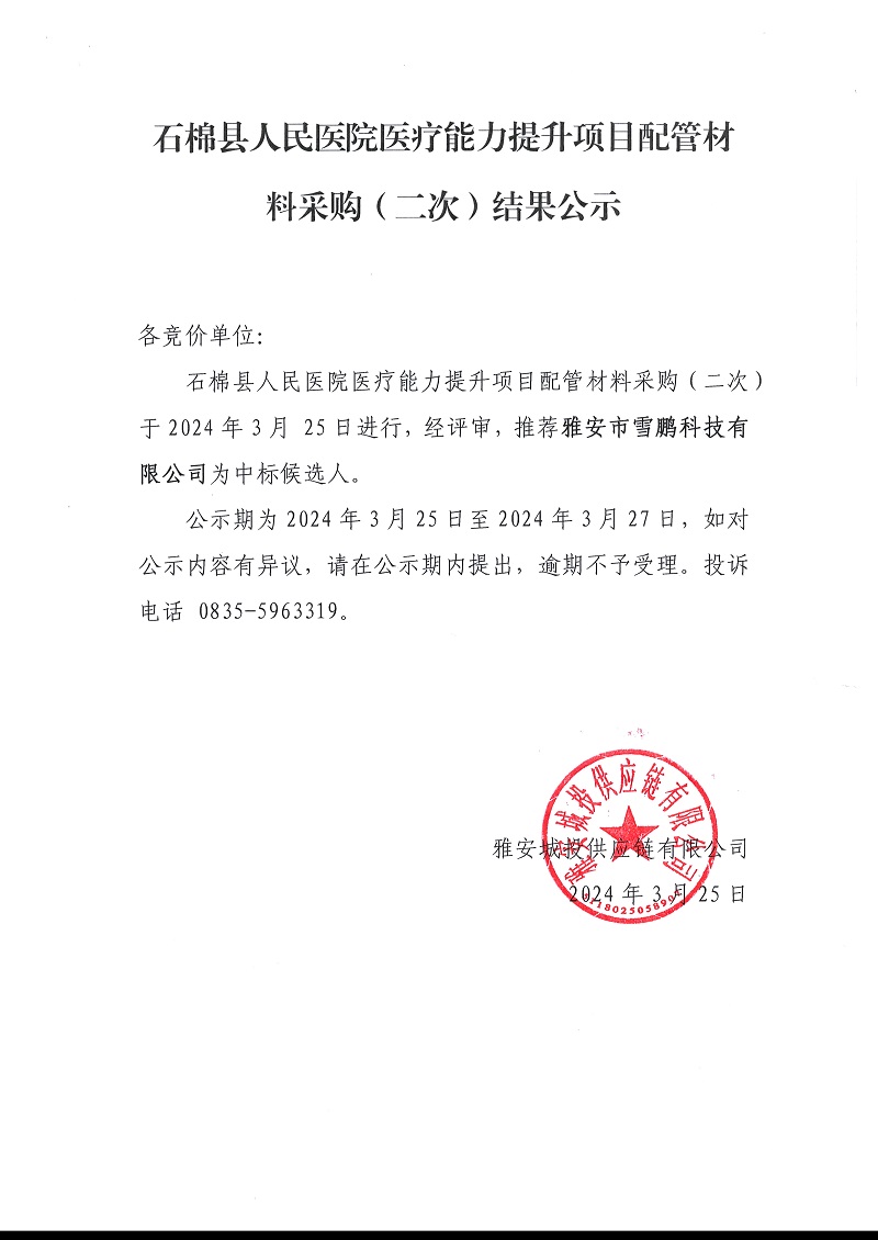石棉縣人民醫(yī)院醫(yī)療能力提升項(xiàng)目配管材料采購(二次)結(jié)果公示