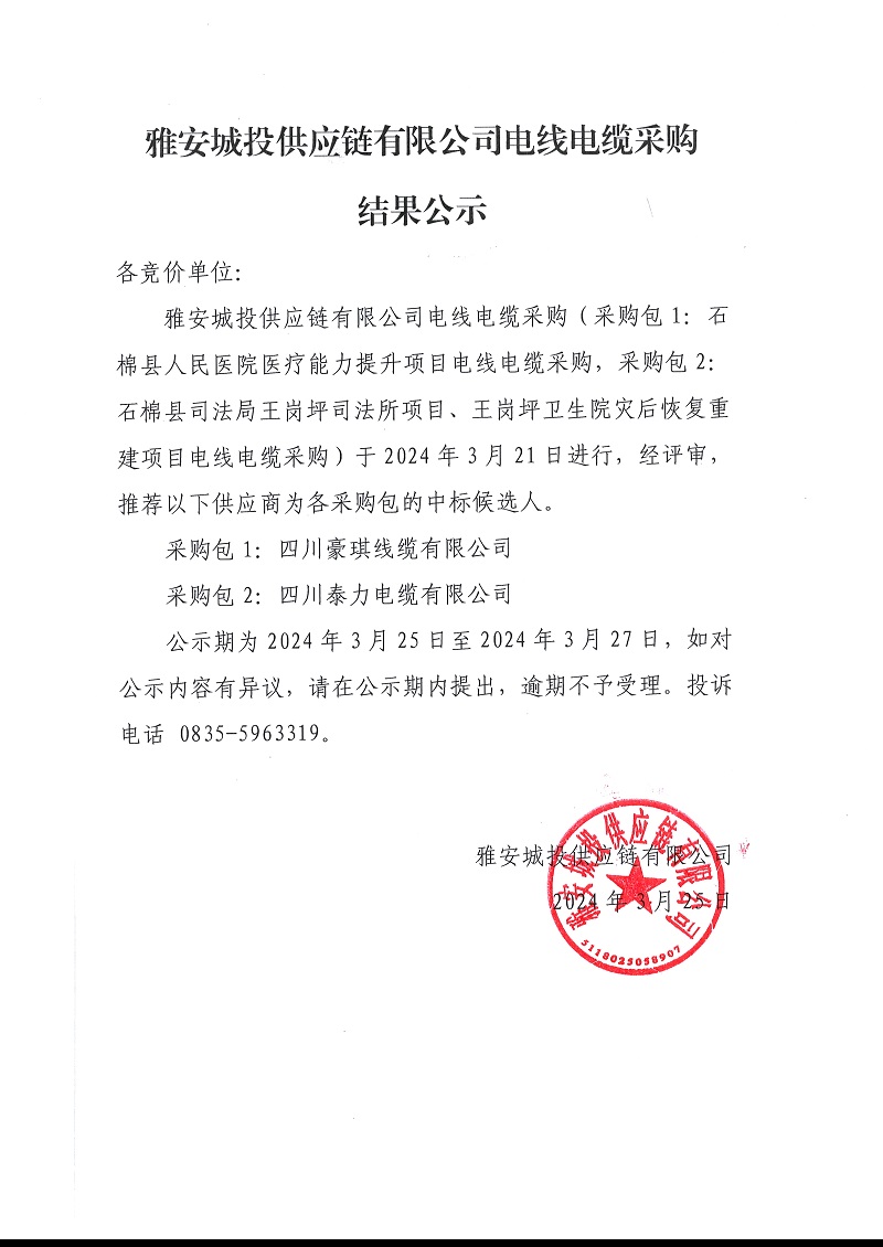 雅安城投供應(yīng)鏈有限公司電線電纜采購結(jié)果公示