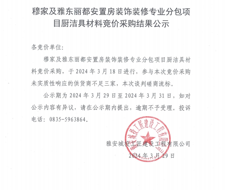穆家及雅東麗都安置房裝飾裝修專業(yè)分包項(xiàng)目廚潔具材料競價(jià)采購結(jié)果公示