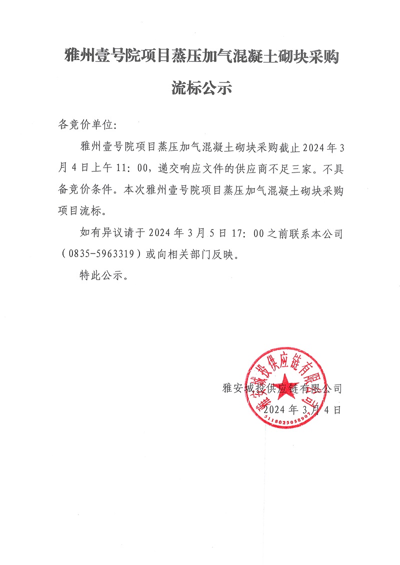 雅州壹號(hào)院項(xiàng)目蒸壓加氣混凝土砌塊采購流標(biāo)公示