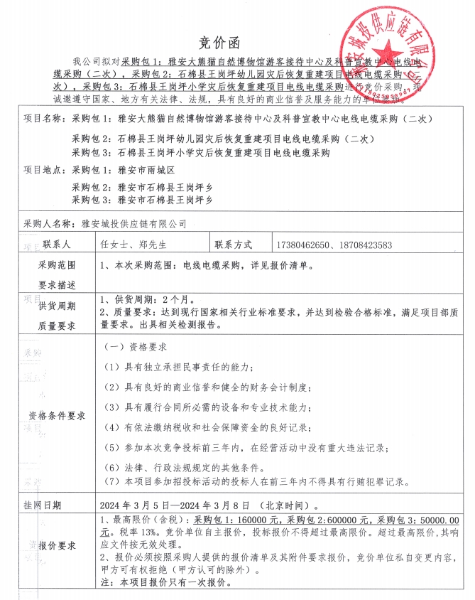 雅安城投供應鏈有限公司電線電纜采購競價公告