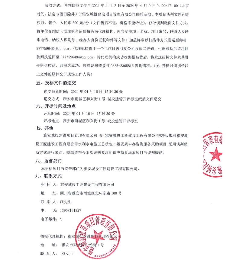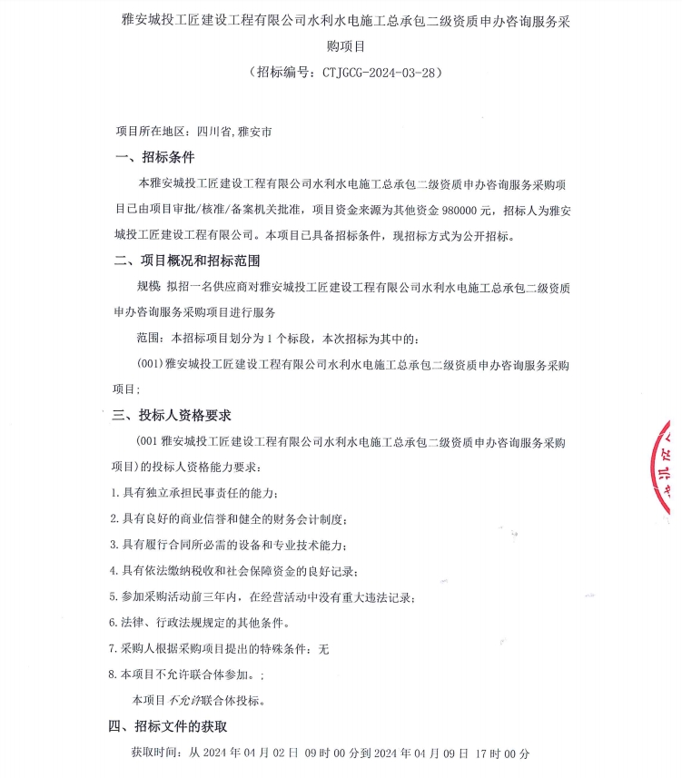 雅安城投工匠建設(shè)工程有限公司水利水電施工總承包二級資質(zhì)申辦咨詢服務(wù)采購項目公告