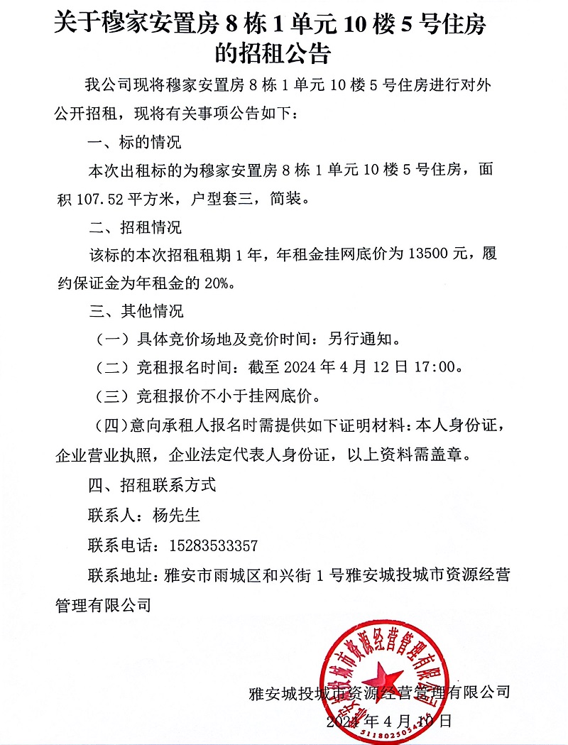關(guān)于穆家安置房8棟1單元10樓5號住房的招租公告