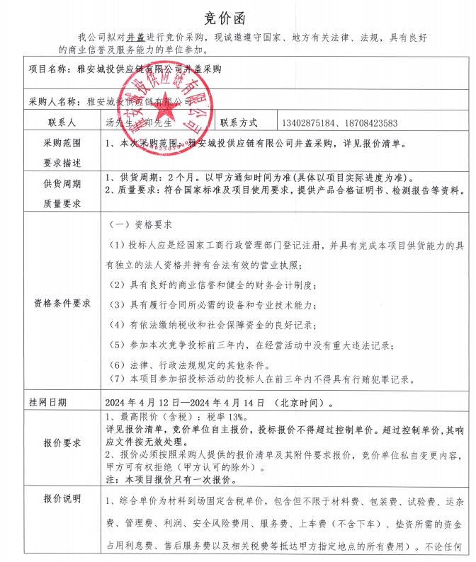 雅安城投供應(yīng)鏈有限公司井蓋采購競價(jià)公告