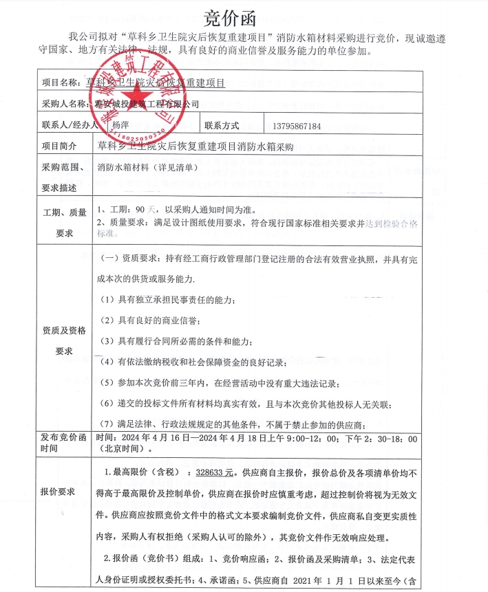 石棉縣草科鄉(xiāng)衛(wèi)生院災(zāi)后恢復(fù)重建項(xiàng)目消防水箱材料采購(gòu)競(jìng)價(jià)公告