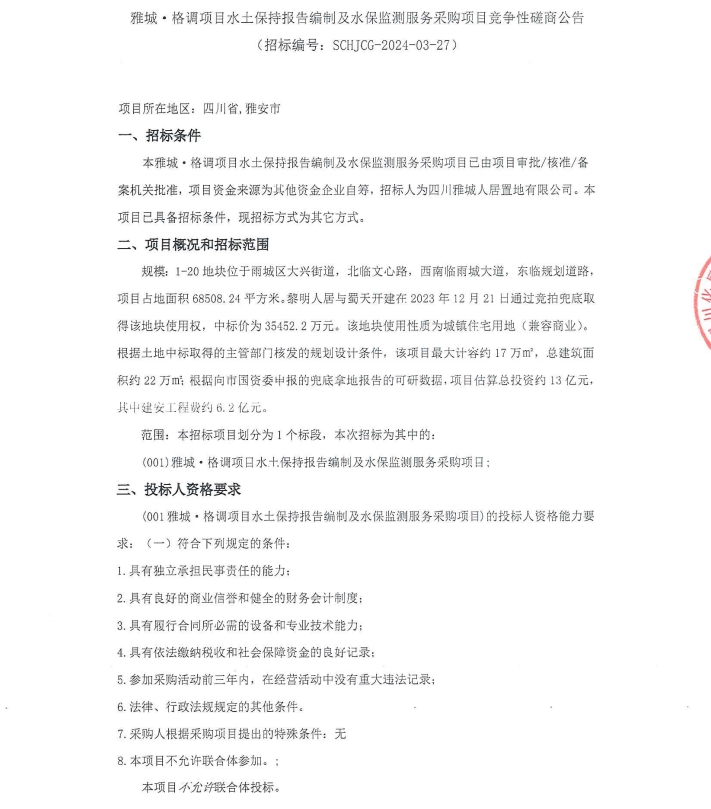 雅城·格調(diào)項(xiàng)目水土保持報(bào)告編制及水保監(jiān)測(cè)服務(wù)采購項(xiàng)目競爭性磋商公告