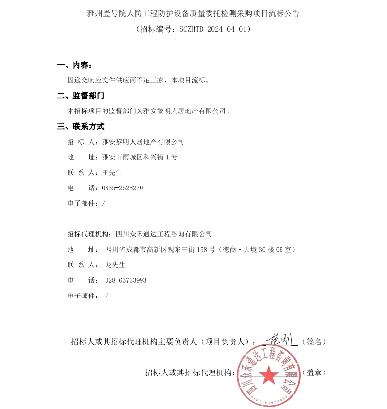 雅州壹號(hào)院人防工程防護(hù)設(shè)備質(zhì)量委托檢測(cè)采購(gòu)項(xiàng)目流標(biāo)公告